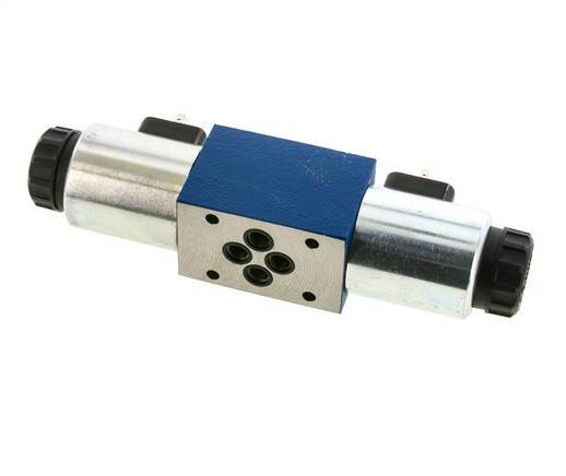 Bosch Rexroth direct bediende 4/2 weg hydraulische magneetklep met NG6 (D03) montage-interface (de montage-interface NG 6 is gestandaardiseerd volgens DIN 24340-A6, ISO 4401-03, CETOP R 35 H-03 en NFPA-D03) en een 24 V DC spoel. De klep heeft een gietijzer behuizing met NBR (nitrilrubber) afdichting. Aan beide zijden kan een vergrendelingsmechanisme worden toegevoegd om een van de twee posities vast te zetten. Geschikt voor systemen met een maximale druk van 350 bar en een temperatuurbereik van -15 tot 80 °C. De klep heeft een debiet van 80 l / min en een maximale viscositeit van 400 cSt. De NBR-afdichting (nitrilrubber) is geschikt voor minerale oliën. Handmatige bediening kan worden gebruikt om het systeem in bedrijf te stellen tijdens stroomuitval. De handmatige bediening kan tot maximaal 5-10 bar gebruikt worden. Deze magneetklep bezit een arreteermechanisme. Tijdens bedrijf kan de permanente stroomtoevoer naar de elektromagneet dus worden weggelaten, wat bijdraagt aan een energiezuinige werking. Aangezien de klep een maximale bedrijfsdruk heeft van 350 bar (5075 psi), kan hij worden gebruikt voor hogedruktoepassingen. De klep heeft een IP beschermingswaarde van IP65.
