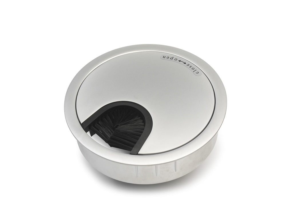 Professionele metalen bureau grommet ontworpen voor georganiseerde kabelbeheer door kantoor bureaus en werkstations. Beschikt over een opening van 60mm diameter en een premium matte chroomafwerking. Installatie vereist een 60mm gatenzaag. Biedt een schone, professionele oplossing voor het geleiden van kabels en draden door werkoppervlakken.