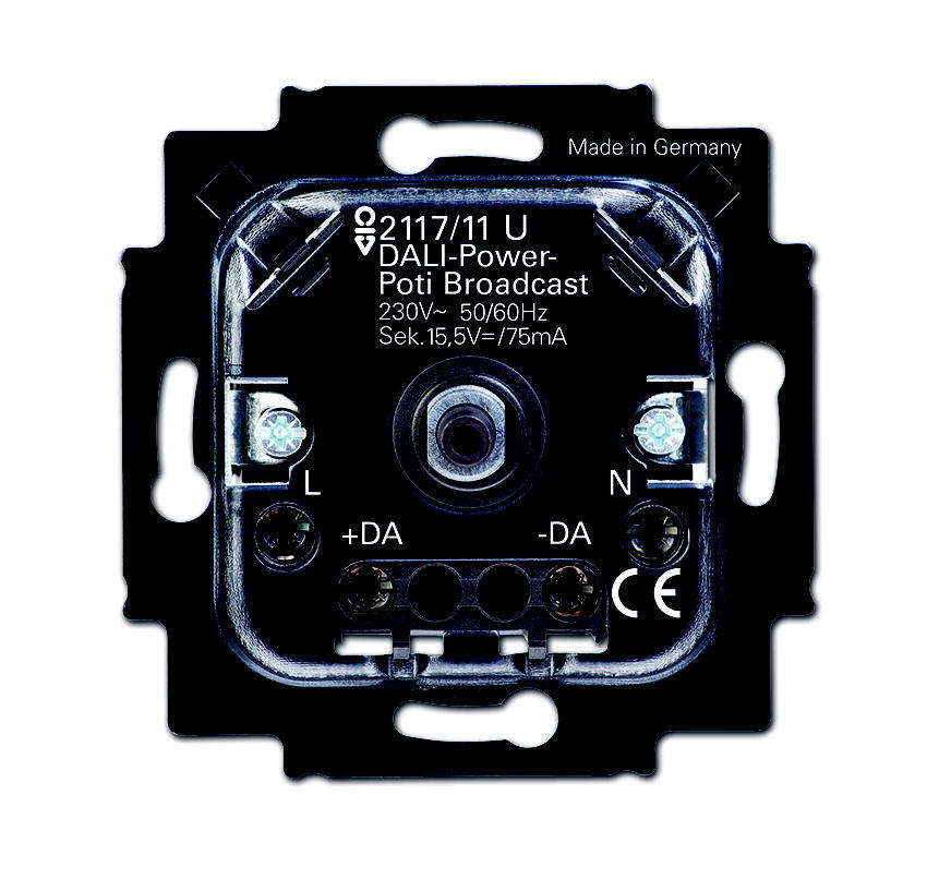 Abb Busch-Jaeger potentiometer vr lichtregelsysteem, bedieningswijze draai-/drukknop, frequentie 50 - 60Hz, lichtwaardegeheugen, inbouw, nom. (meet)stroom 0,075A, nominale spanning 230V, breedte schakelkast 71mm, diepte schakelkast 50mm, hoogte schakelkast 71mm.