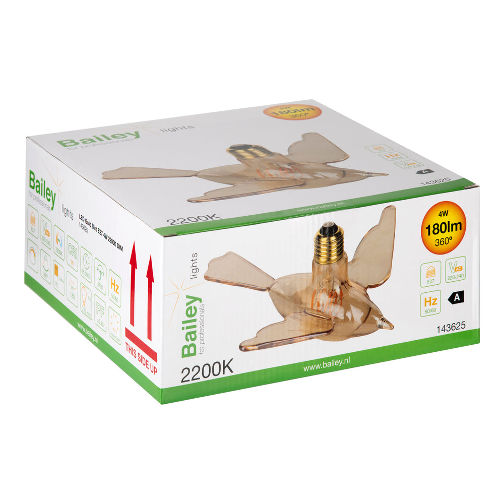De Bailey Bird filamentlamp is een uniek onderdeel van de Designs by Bailey Lights serie. Het unieke ontwerp is gepatenteerd door Bailey. Met een standaard E27 fitting past hij in praktisch alle lamphouders en pendels. Je kunt het ook combineren met Bailey-accessoires of in kooifittingen plaatsen, waardoor je een 'Bird in a Cage'-effect creëert.