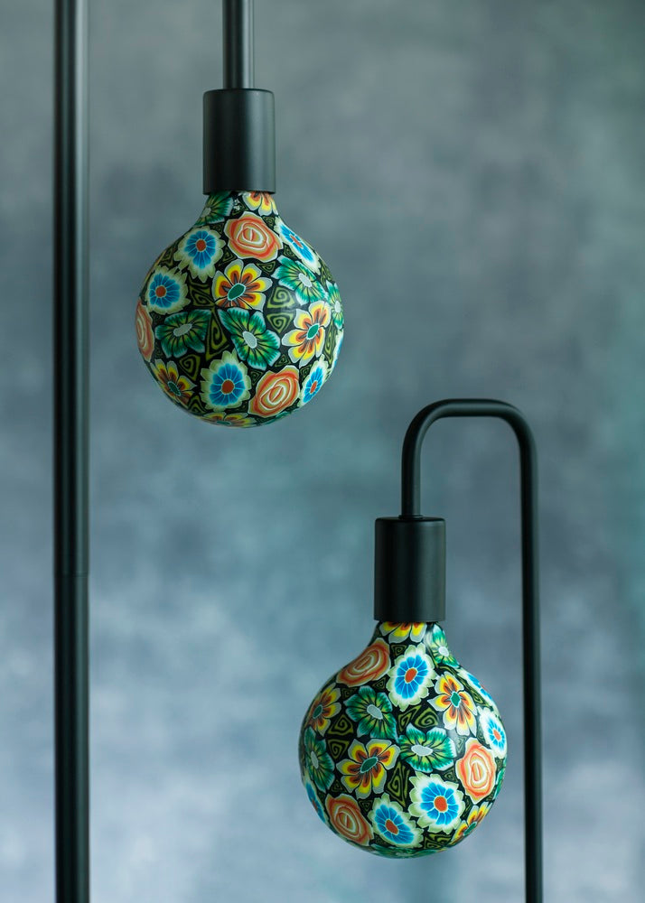 Artistieke LED filament globe lamp met een geschilderde glazen oppervlakte en een donker bloemenontwerp. Deze E27 retrofit lamp produceert 100 lumen bij 1900K, werkt op 230-240V met 360° lichtverdeling. De decoratieve lamp van 125x175mm combineert energie-efficiëntie met hedendaagse esthetiek, en creëert een visuele statement, of deze nu verlicht is of niet.