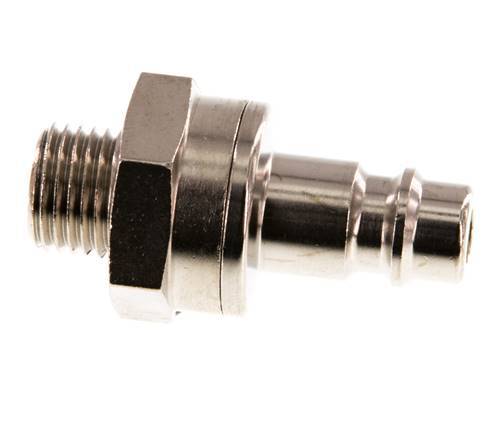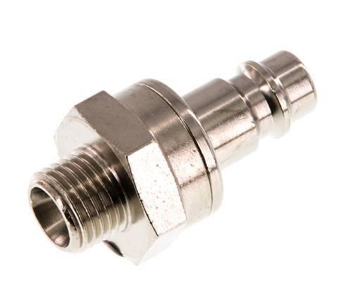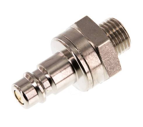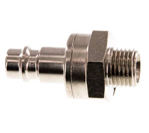 Vernikkeld messing DN 7,2 (Euro) luchtkoppelingsplug met G 1/4 inch buitendraad. Een pneumatische koppeling wordt gebruikt om luchtgereedschap snel op een persluchtleiding aan te sluiten. De koppeling bestaat uit twee delen: de snelkoppeling (binnendraad deel) en de stekker of nippel (buitendraad deel). Wanneer de koppeling wordt losgekoppeld, schakelt hij automatisch uit om de leidingdruk te handhaven.