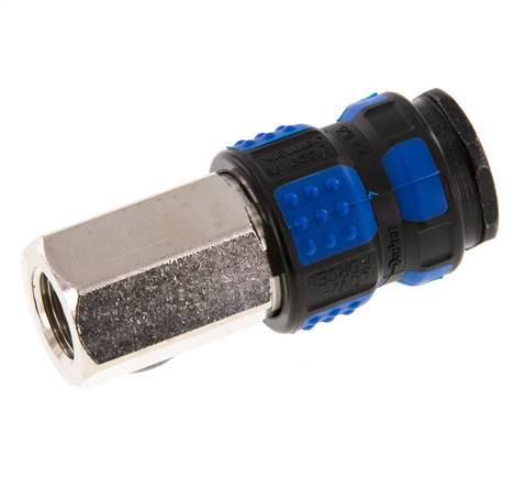 Dankzij de G 1/4 inch binnendraad kan hij op een bijpassend onderdeel met buitendraad worden geschroefd. Deze koppeling is geschikt voor vacuümtoepassingen. De fitting heeft een duurzaam kogelvergrendelingsontwerp. Het werkdrukbereik is -0,95 tot 35 bar. De socket is geschikt voor temperaturen tussen -20 en 80°C. Het nominale debiet is 2100 l/min. Het afdichtingsmateriaal is NBR (nitrilrubber). Het materiaal van de hoes is plastic. De behuizing van vernikkeld messing heeft een vernikkelde oppervlaktebescherming.