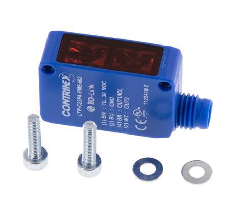 Deze diffuus-reflecterende foto-elektrische sensor heeft een zender en ontvanger geïntegreerd in dezelfde behuizing. Het detectiebereik loopt van 3 tot 1500 mm en de maximale schakelafstand bedraagt 1300 mm. Het heeft een M8 connector met 4 pinnen. Omschakelmodus: PIN 4 - licht schakelen / IO link, PIN 2 - donker schakelen. De bedrijfsspanning 10 - 30 V DC en de regeluitgang 100mA (PNP). De sensor is geschikt voor IO-Link.