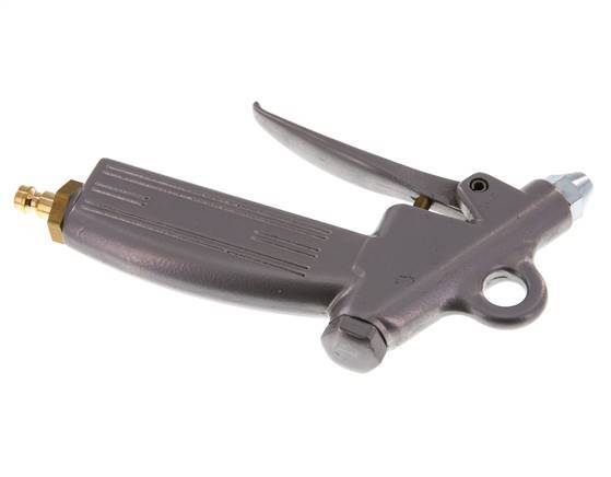 Aluminium blaaspistool met een DN 5 Orion luchtkoppeling inlaatpoort. Het blaaspistool is uitgerust met een verzinkt stalen kort mondstuk. Het heeft een boring van 1.5 mm. Het mondstuk is met M12x1.25 schroefdraad in het pistool gedraaid. Voor een drukbereik van 1 tot 10 bar en temperaturen van -10 tot 50°C. De interne onderdelen zijn gemaakt van messing en roestvrij staal met een NBR afdichting.
