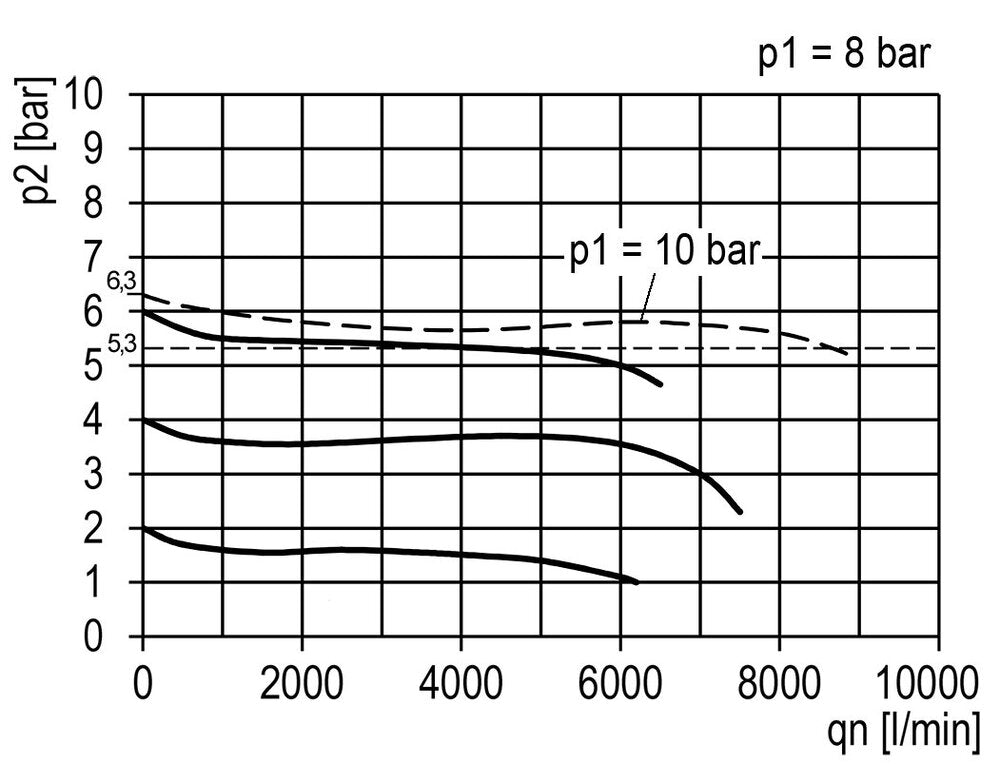 De drukregelaar past de druk continu aan tot een stabiel niveau, zelfs wanneer de ingangsdruk varieert. Het niveau kan worden ingesteld tussen 0,2 en 6,0 bar. Dit model heeft G 1/2 inch poorten. Het maximale debiet is 8700 l/min. Houd er rekening mee dat het maximale debiet alleen niet voldoende informatie geeft voor een juiste dimensionering. Gebruik de debietcurve om te bepalen of de drukval binnen uw verwachte debietbereik aanvaardbaar is. De debietcurve toont het debiet voor een ingestelde ingangsdruk met meerdere uitgangsdrukken. Voor elke uitgangsdruk is te zien hoe de druk verandert naarmate het debiet toeneemt. Aanbevolen wordt het apparaat te gebruiken in het vlakke bereik van de curve, en niet aan het begin of het einde van de curve. Merk op dat de drukregelaar de uitgangsdruk regelt, niet het debiet. De uitgangsdruk kan worden aangepast door het handwiel omhoog te trekken en te draaien. Het kan na afstelling worden vergrendeld door het handwiel weer in te drukken.