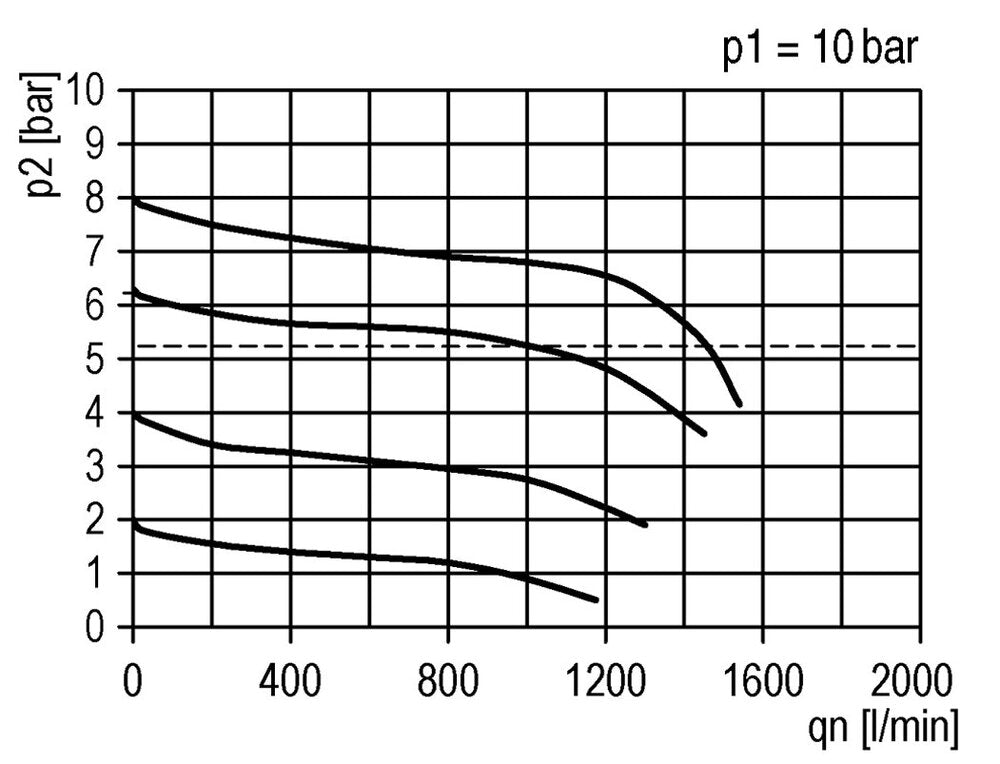 De drukregelaar past de druk continu aan tot een stabiel niveau, zelfs wanneer de ingangsdruk varieert. Het niveau kan worden ingesteld tussen 0,5 en 10,0 bar. Dit model heeft G 1/4 inch poorten. Het maximale debiet is 1000 l/min. Houd er rekening mee dat het maximale debiet alleen niet voldoende informatie geeft voor een juiste dimensionering. Gebruik de debietcurve om te bepalen of de drukval binnen uw verwachte debietbereik aanvaardbaar is. De debietcurve toont het debiet voor een ingestelde ingangsdruk met meerdere uitgangsdrukken. Voor elke uitgangsdruk is te zien hoe de druk verandert naarmate het debiet toeneemt. Aanbevolen wordt het apparaat te gebruiken in het vlakke bereik van de curve, en niet aan het begin of het einde van de curve. Merk op dat de drukregelaar de uitgangsdruk regelt, niet het debiet. De uitgangsdruk kan worden aangepast door het handwiel omhoog te trekken en te draaien.