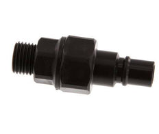 Polyoxymethyleen (POM) DN 7.2 koppeling stekker met G 1/4 inch buitendraad. De koppeling heeft een terugslagklep om terugstroming te voorkomen en de insteeksocket sluit ook af wanneer deze is losgekoppeld. Het werkdrukbereik is 0 tot 10 bar (0 tot 145 psi). De koppeling is geschikt voor temperaturen tussen -20 en 80 °C (-4 tot 176 °F).