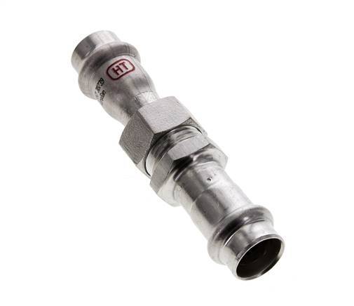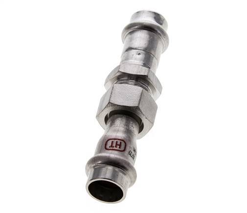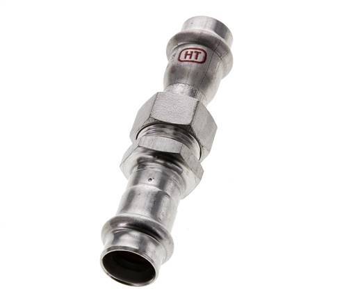 Dit is een rechte persfitting van roestvrij staal 1.4404. De fitting heeft twee vrouwelijke perspoorten. Aansluiting 1 en 2 zijn ontworpen voor een buis met een buitendiameter van 15 mm. De fitting heeft een FKM-afdichtingsring. Het heeft ook een platte afdichting van centellen. De maximumdruk is 40 bar. De fitting is geschikt voor temperaturen van -20 tot 200 °C . Tijdelijk kan de maximumtemperatuur +280 °C zijn. De fittinglengte is 104 mm.