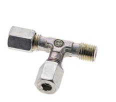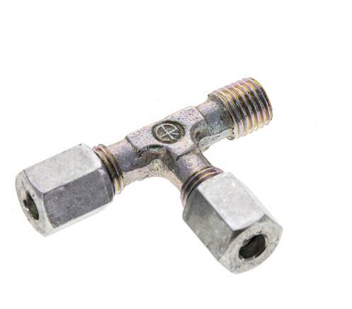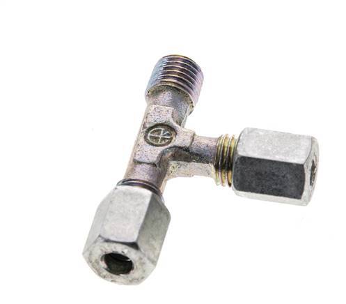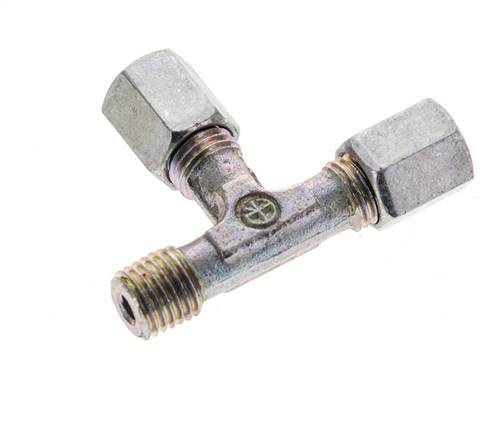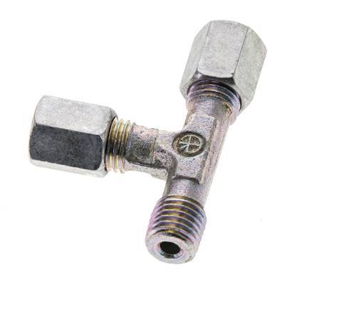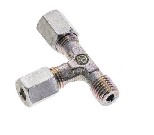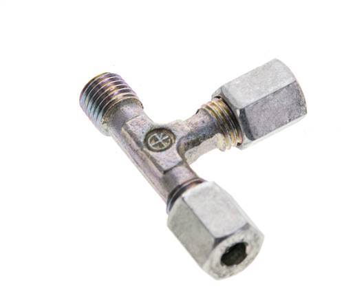 Deze verzinkte stalen T-stuk snijringkoppeling is ontworpen met een buitendraadverbinding en twee snijringverbindingspoorten in een L-vorm. Aansluiting 1 is een 4 mm snijring met een M8x1 wartelmoer. Aansluiting 2 is een 4 mm snijring met een M8x1 wartelmoer. Aansluiting 3 heeft M 8x1 (conische) buitendraad. De maximumdruk is 100 bar. De fitting is geschikt voor temperaturen van -40 tot 120 °C (-40 tot 248 °F). Hij is vervaardigd overeenkomstig DIN EN ISO 8434-1 (DIN 2353).
