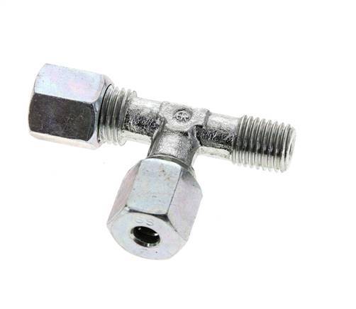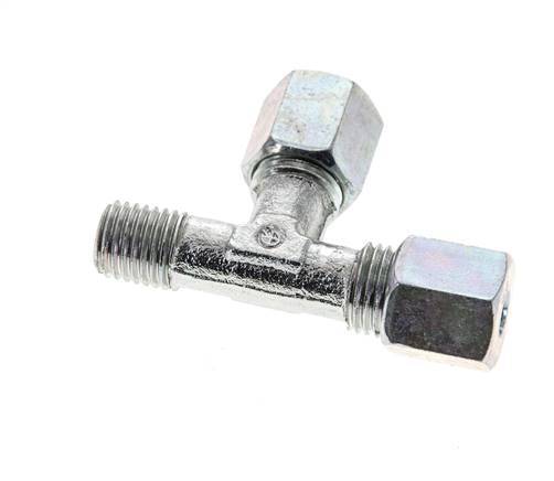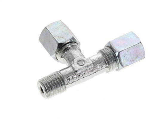 Deze verzinkte stalen T-stuk snijringkoppeling is ontworpen met een buitendraadverbinding en twee snijringverbindingspoorten in een L-vorm. Aansluiting 1 is een 6 mm snijring met een M14x1,5 wartelmoer. Aansluiting 2 is een 6 mm snijring met een M14x1,5 wartelmoer. Aansluiting 3 heeft M 12x1,5 (conische) buitendraad. De maximumdruk is 630 bar. De fitting is geschikt voor temperaturen van -40 tot 120 °C (-40 tot 248 °F). Hij is vervaardigd overeenkomstig DIN EN ISO 8434-1 (DIN 2353).