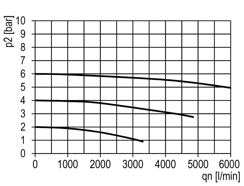 Het filter verwijdert water, vuil en andere schadelijke deeltjes groter dan 5 micron. Het filter verwijdert water, vuil en andere delen die schadelijk zijn voor uw luchtsysteem. Dit model heeft G 3/4 inch poorten. Het maximale debiet bedraagt 5850 l/min. Houd er rekening mee dat het maximale debiet alleen niet voldoende informatie geeft voor een juiste dimensionering. Gebruik de debietcurve om te bepalen of de drukval binnen uw verwachte debietbereik aanvaardbaar is. De debietcurve toont het debiet voor een ingestelde ingangsdruk met meerdere uitgangsdrukken. Voor elke uitgangsdruk is te zien hoe de druk verandert naarmate het debiet toeneemt. Aanbevolen wordt het apparaat te gebruiken in het vlakke bereik van de curve, en niet aan het begin of het einde van de curve.