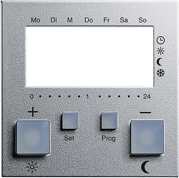 Dit artikel is een hoes die speciaal is ontworpen voor een kamertemperatuurregelaar die werkt op 230 V~ en een ingebouwde klok en koelfunctie heeft. Hij maakt deel uit van het System 55-assortiment en heeft een esthetische aluminium afwerking. De afdekking maakt deel uit van een reeks accessoires en reserveonderdelen voor schakelaars en zorgt voor een perfecte pasvorm en naadloze integratie.