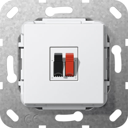 Professionele enkele luidspreker aansluitinsert met voorste plugterminals (rood/zwart) en achterste schroefterminals voor een veilige installatie. Dit basisunit maakt deel uit van de Gira System 55 serie en vereist een afdekking voor voltooiing. Gemaakt van slagvast thermoplast met hoge UV-bestendigheid, ontworpen voor wandbevestiging met schroeffixatie.