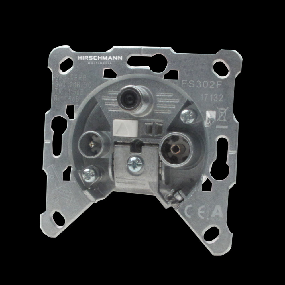 FS 302F is een wandcontactdoos voor CAI en FM en SAT. Deze aansluiting heeft 3 uitgangen: de linker is voor TV (IEC mannelijk), de rechter voor FM (IEC vrouwelijk) en de bovenste voor SAT (F vrouwelijk). Ongebruikte uitgangen moeten worden afgesloten om instraling van ongewenste signalen te voorkomen. Deze stekkerdoos heeft de zogenaamde pushlock-technologie zodat de kabel snel, eenvoudig en veilig kan worden vastgezet met één druk op de knop. Het montageframe is universeel toepasbaar met alle bekende merken in- en opbouwapparatuur. De hoeken zijn afbreekbaar voor ronde inbouwdozen.