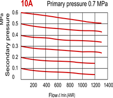 Deze filter-regelaar (FR) combineert twee functies. Het filter verwijdert water, vuil en andere schadelijke deeltjes groter dan 5 μm voor uw luchtsysteem. De drukregelaar past de druk continu aan tot een stabiel niveau, zelfs wanneer de ingangsdruk varieert. Het niveau kan worden ingesteld tussen 0,5 - 8,5 bar. Dit model heeft G 3/8" poorten. Het maximale debiet bedraagt 1300 l/min. Houd er rekening mee dat het maximale debiet alleen niet voldoende informatie geeft om uw filterregelaar goed te dimensioneren. Gebruik de debietcurve om te bepalen of de drukval binnen uw verwachte debietbereik aanvaardbaar is. De debietcurve toont het debiet voor een ingestelde ingangsdruk met meerdere uitgangsdrukken. Voor elke uitgangsdruk is te zien hoe de druk verandert naarmate het debiet toeneemt. Aanbevolen wordt het apparaat te gebruiken in het vlakke bereik van de curve, en niet aan het begin of het einde van de curve. Merk op dat de drukregelaar de uitgangsdruk regelt, niet het debiet. De uitgangsdruk kan worden aangepast door het handwiel omhoog te trekken en te draaien. De uitgangsdruk kan na afstelling worden vergrendeld door het handwiel weer in te drukken. De maximale ingangsdruk is 10 bar en het temperatuurbereik ligt tussen -5 en 60 °C. Het filter is berekend op 5 micron, wat betekent dat het geen verontreinigingen groter dan dit doorlaat. Voor het legen heeft hij een halfautomatische condensaataftap met een afvoercapaciteit van 30 cm3. Het materiaal van de behuizing is van aluminium en het filter heeft een container van polycarbonaat (PC). Het heeft een positie-indicator om het niveau van de container te zien. Het heeft een montagebeugel om het aan een muur of uw machine te bevestigen.