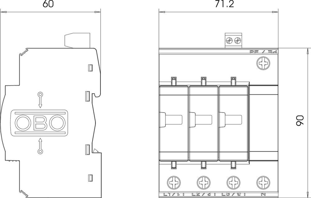 Obo V50 280 overspanningsbeveiliging, oranje, pooluitvoering 3+N/PE, beschermingsklasse B grof/C middel, netvoeding TT +TN-S, met meldcontact, DRA (DIN-rail adapter), DIN-rail module uitvoering, nominale spanning 280V.