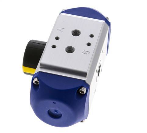 Door een pneumatische actuator toe te voegen aan een kogel- of vlinderklep met kwartslag, kunnen ze op afstand worden bediend met perslucht om de systeemautomatisering te verhogen. Pneumatische aandrijvingen zijn een betrouwbare oplossing om grotere kleppen te bedienen tegen relatief lage investeringskosten. Deze kleppen hebben gewoonlijk een ISO 5211 montageflens, zodat zij voorbereid zijn op een actuator. Deze actuator is compatibel met ISO 5211 F04 kleppen en heeft een 11 mm steraansluiting voor vierkante aandrijfassen. De as kan met behulp van adapters worden verkleind. Controleer zorgvuldig het gegevensblad en de flensafmetingen van uw klep, want er zijn veel variaties op de markt. Deze actuator genereert 4,5 Nm koppel bij 6 bar, maar heeft een stuurdrukvenster van 6-10 bar om het koppel te verhogen/verlagen. De actuator is enkelwerkend, veer open om perslucht te besparen en keert automatisch terug naar de uitgangspositie in geval van lucht- of stroomuitval. Het is ontworpen met een betrouwbare aluminium tandheugel en rondsel. Door het gebruik van smoorkleppen op de uitlaatpoorten (na de magneetklep) kan de draaisnelheid worden aangepast. Deze actuators zijn duurzaam met een behuizing van geanodiseerd aluminium en een deksel van acetalhars. Dankzij de NBR-afdichting is het temperatuurbereik -20°C tot 80°C. De actuator heeft G 1/8 inch poorten voor de luchttoevoer en -retour. We raden aan om een 1/4 inch Namur-magneetventiel rechtstreeks op de actuator te monteren om de luchttoevoer te regelen. Merk op dat 1/4 verwijst naar de Namur-maat van de klep, niet naar de poortmaat. Ook kan een positiecontrole- of eindschakelaarkast worden gemonteerd op de bovenkant van de actuator volgens VDI/VDE 3845. De actuator is ATEX-gecertificeerd (EX II 2GD c) en mag daarom worden gebruikt in omgevingen met explosiegevaar.