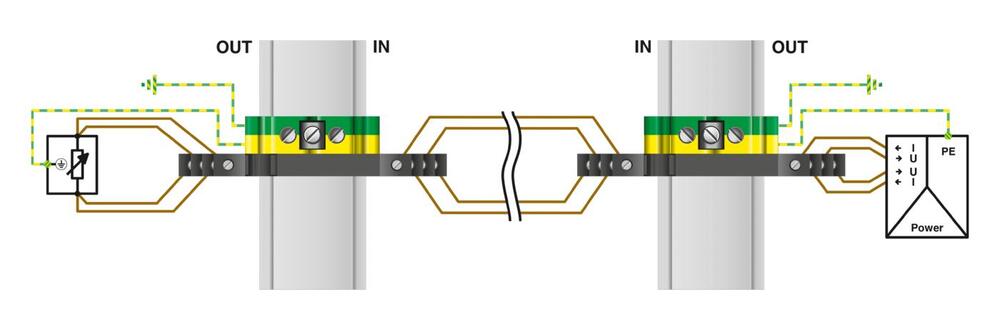 Overspanningsbeveiliging in een 6,2 mm brede DIN-railmodule uit een stuk voor vier zwevende signaaldraden.