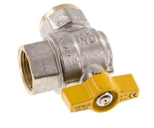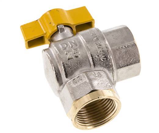 Haakse messing kogelkraan met gas keurmerk. Rp 1 inch schroefdraad. De interne doorlaat is 25 mm en de maximale druk is 40 bar. De klep is geschikt voor neutrale gassen en vloeistoffen en heeft een DVGW gasgoedkeuring (bijv. aardgas, stadsgas, vloeibaar gas tot 5 bar). Het temperatuurbereik is van -15 tot 100 °C en voor brandbaar gas van -20 tot 60 °C. Vernikkeld messing behuizing, verchroomde messing bal en PTFE/NBR afdichtingen.