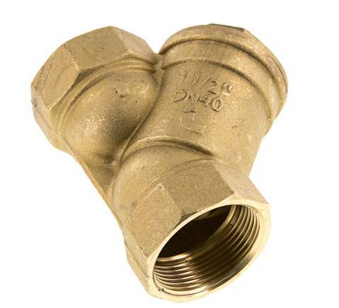 Messing Y-filter met G 1 1/2 inch binnendraad en een roestvrijstalen maas met een filtergrootte van 0,2 mm. Voor media tot 20 bar (290 psi) bij temperaturen tussen -20 °C en 110 °C (-4 tot 230 °F). Te gebruiken in één stroomrichting (zie pijl op behuizing). Het residu verzamelt zich in het filter en kan worden gereinigd door de afdichtingskap los te draaien. De afdichting is gemaakt van NBR (nitrilrubber).