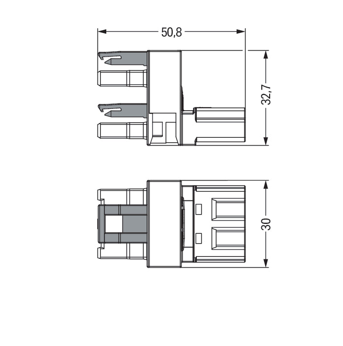 Professionele 3-polige distributieconnector met één ingang en twee uitgangen aan één zijde. Voorzien van dubbele vergrendelingshefbomen voor veilige verbindingen. Ontworpen voor gebouwinstallaties met afmetingen van 51x32,7x30mm. Beoordeeld voor 250V nominale spanning en 25A stroomcapaciteit met IP20 beschermingsklasse.